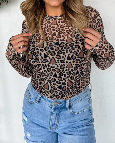 Animal Print & Christmas Trees Mesh Long Sleeve Top