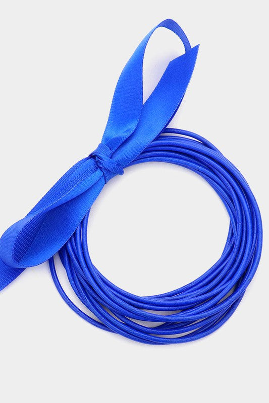 These stackable stretch bracelets, made from guitar strings, come in vibrant multi, blue, or purple colors. Measuring 0.75" in height, they fit comfortably on your wrist thanks to their stretchable design. Each set includes 15 pieces, all compliant with lead and nickel safety standards. Perfect for layering or sharing, these bracelets combine unique style with safe, flexible wear.