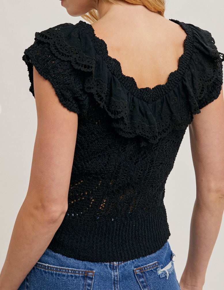 Short-sleeved eyelet sweater knit top with lace-trimmed ruffles at the neckline. Textured knit fabric offers warmth and a charming, airy design. Perfect for layering or wearing solo across seasons. Model is 5'9" wearing a Small in black. Body: 100% polyester. Trim: 60% nylon, 40% cotton.
