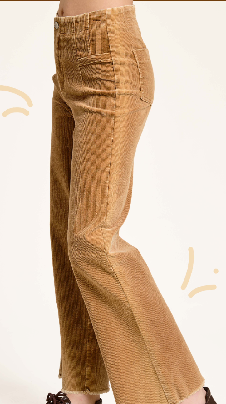 Elevate your everyday style with these camel mineral washed corduroy jeansโa versatile essential that works for any occasion. The soft, comfortable fabrication makes them perfect for all-day wear, while thoughtful details like the front dart design add visual interest and dimension. Features include a classic zip fly and button closure, functional back pockets, and a trendy raw-edge hemline that gives these jeans an effortlessly polished finish. Whether you're dressing them up or down, this wardrobe staple deserves a permanent spot in your rotation.