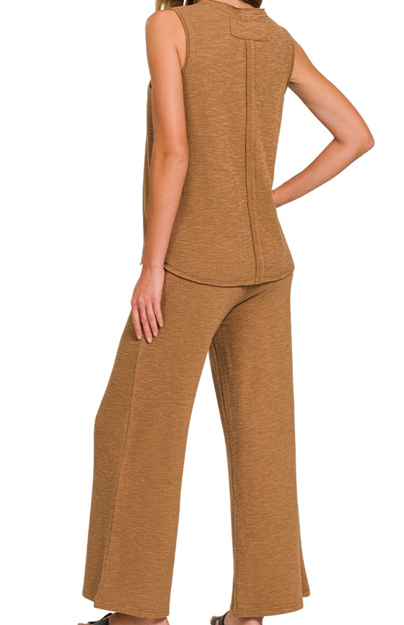 This cotton slub tank and pants set is made of good quality fabric. The top has a total body length of 24 inches and a bust measurement of 36 inches, while the pants have a total waist of 25 inches and an inseam of 27.5 inches. Perfect for a comfortable and stylish look.