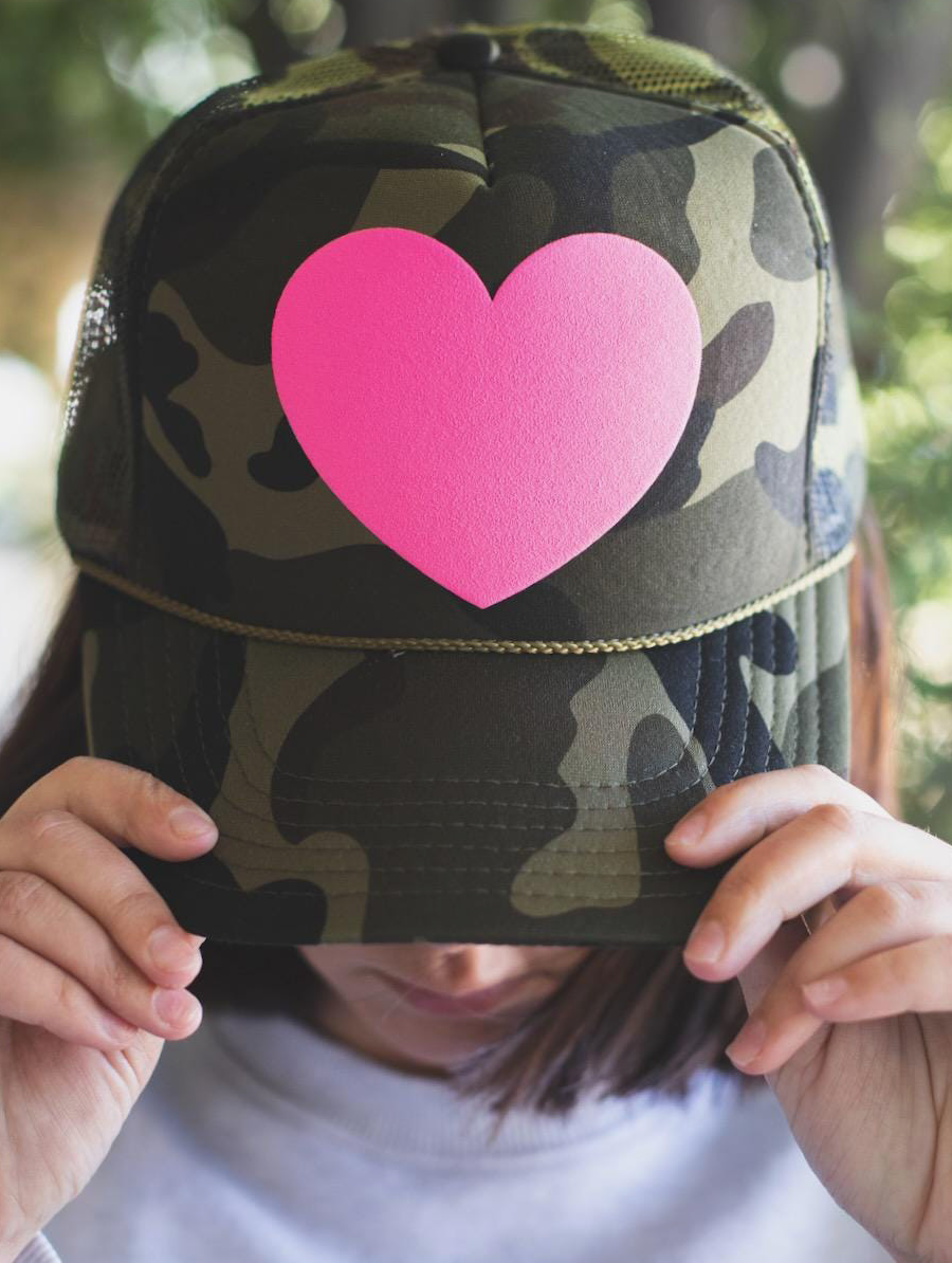 Otto Camo Trucker Hat with Pink Puff Heart Make a statement with this eye-catching trucker hat that blends edgy camo styling with a playful touch. The standout pink puff heart appliqué adds personality and charm, perfect for expressing your unique style. Featuring a classic snapback closure for an adjustable, comfortable fit all day long. Whether you're heading out for casual adventures or want to add a fun accent to your everyday look, this hat delivers both attitude and approachability in one versatile piece.