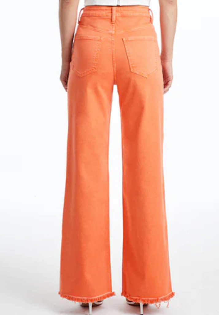 Step into effortless style with these coral wide-leg jeans that combine timeless appeal with modern comfort. Built with a thoughtful fabric blend—93% cotton for breathability, 5% polyester for durability, and 2% spandex for flexibility—these jeans move with your body throughout the day. The high-rise silhouette provides flattering coverage while the super-stretch construction ensures a perfect fit every time you wear them. Versatile enough for weekend errands or night-out looks. Model details: 5'8" tall, 24" waist, wearing size 26/S.