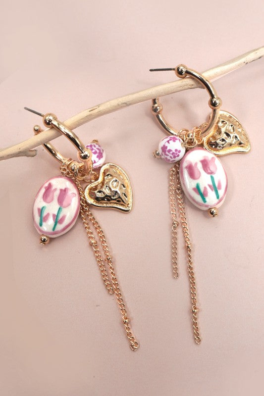 Gold-tone mini hoops adorned with an enchanting mix of charms—hammered heart pendants, hand-painted porcelain tulip beads, delicate floral accents, and swaying gold chains. Each pair captures romantic, vintage-inspired elegance with whimsical movement. Crafted with hypoallergenic titanium posts and double E-coating for lasting durability, these lightweight earrings are perfect for sensitive ears. Measuring 1" wide by 2" long, they're lead and nickel compliant for worry-free wear.