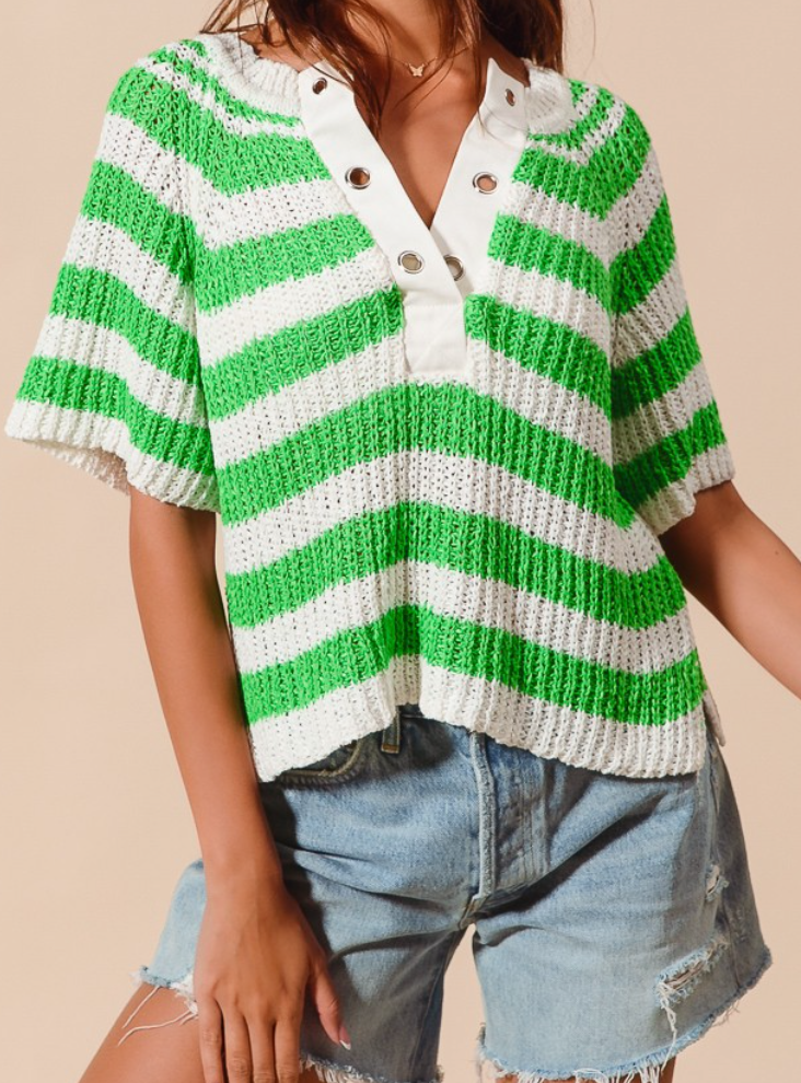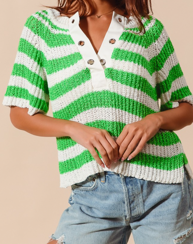 Elevate your casual wardrobe with this charming striped sweater top featuring a classic green and white palette. The eyelet placket detail adds a touch of sophistication and visual interest to the neckline, making it perfect for layering or wearing solo. Crafted from a comfortable acrylic and polyester blend, this piece offers durability and easy care while maintaining its shape and softness through regular wear.