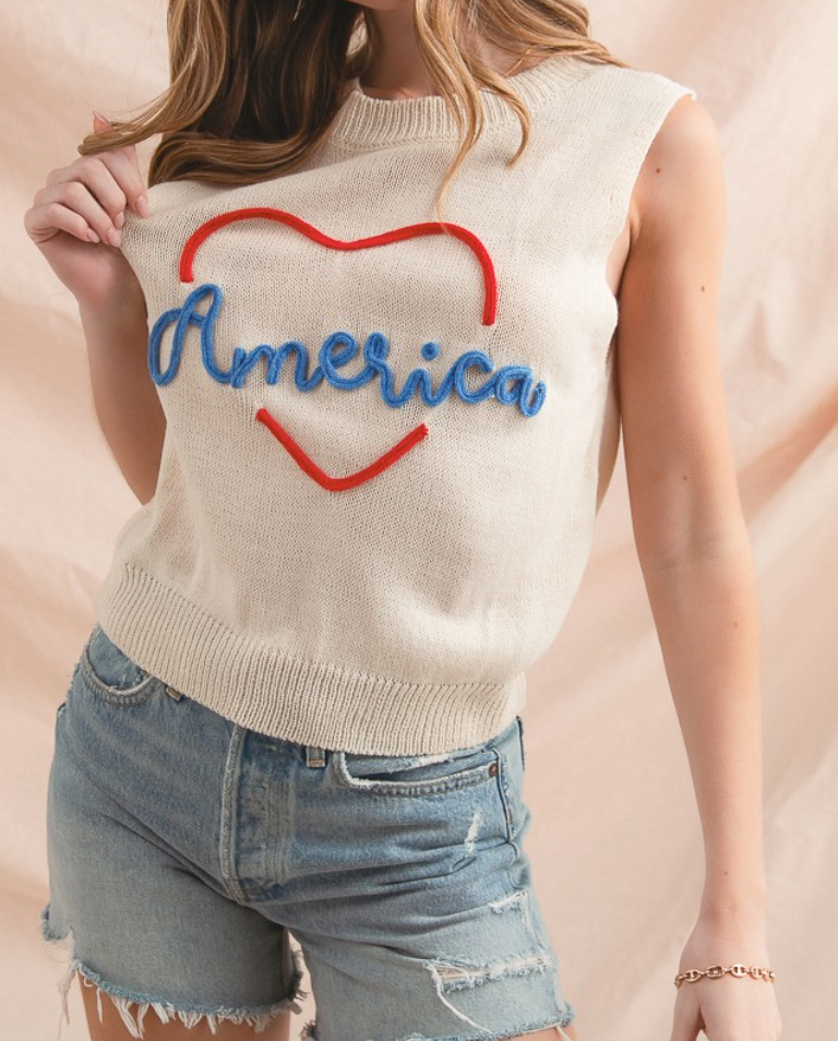 Celebrate patriotic style with this eye-catching sleeveless sweater top featuring bold "AMERICA HEART" lettering perfect for Memorial Day, World Cup, & Fourth of July festivities. Crafted from 100% polyester, this ivory sweater offers a lightweight, easy-care option that maintains its shape and color through countless wears. The classic sleeveless design pairs effortlessly with jackets, cardigans, or worn solo for a statement look. Ideal for holiday gatherings, casual outings, or anyone wanting to showcase their American spirit with confidence and comfort.
