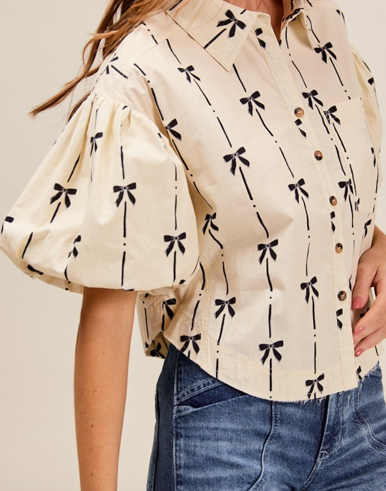 This blouse features a charming ivory and black bow ribbon print on a soft, 100% cotton fabric, ensuring breathable comfort throughout the day. The woven button-up design is complemented by delicate puff sleeves, adding a feminine and stylish touch. Ideal for both casual and dressier occasions, this shirt combines classic elegance with comfortable wearability.