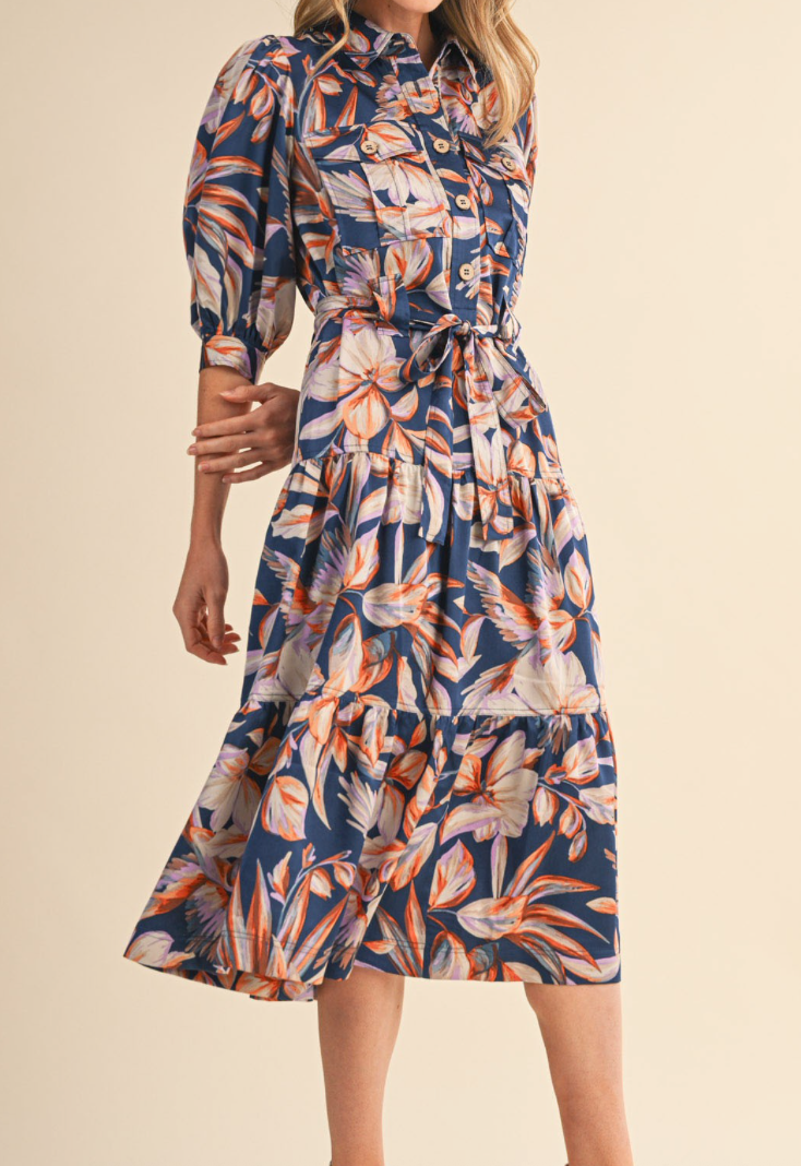 This navy tiered midi dress combines timeless style with everyday practicality. Featuring an elegant leaf print, collared neckline, and button-down front, it's designed to flatter and inspire confidence. The elbow-length puff sleeves with buttoned cuffs add a refined touch, while the adjustable tying sash and wide belt loops let you customize the fit to your body. Functional front pockets and a graceful tiered hem complete the look. Made from easy-care 100% polyester, this dress transitions beautifully from work to weekend occasions.