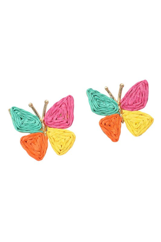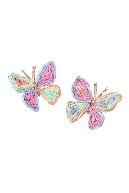 Delicate butterfly silhouettes crafted from woven raffia with dimensional layered detailing create an effortlessly charming accessory. These lightweight stud earrings measure 1.5" x 1.3" and feature post backs for secure, comfortable wear. Choose from three enchanting color combinations: light and dark pink, pastel mix, or spring mix to match your mood and wardrobe. Lead and nickel compliant, they're perfect for everyday styling, seasonal collections, or as a thoughtful gift. Bring playful elegance to any look with these boutique-inspired earrings.