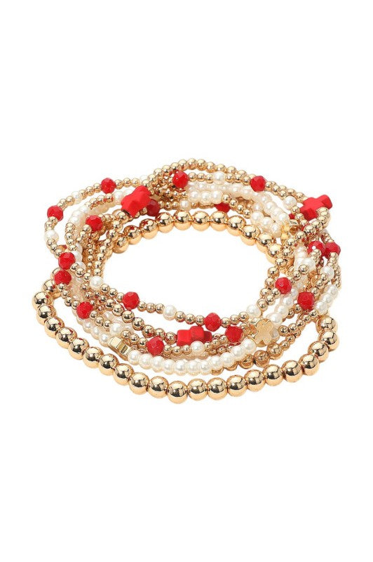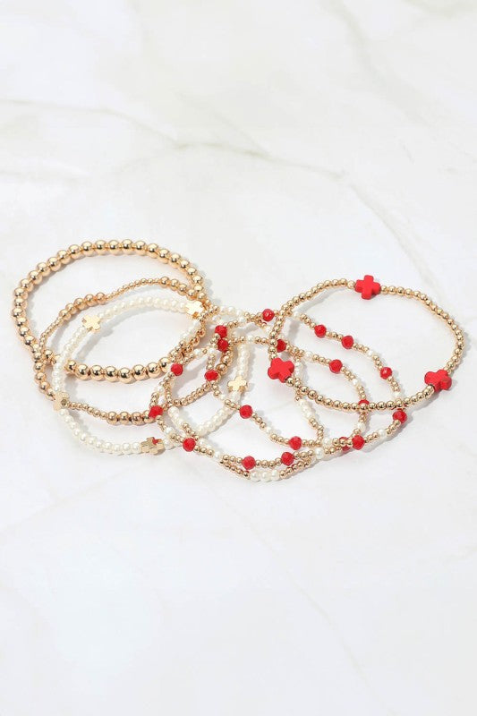 This stunning seven-piece bracelet set combines timeless elegance with modern versatility. Featuring rich red and gold tones, each strand showcases a blend of smooth pearls and faceted beads accented with delicate cross charms. The stretchable construction delivers a custom fit for any wrist, while the 1.3" height strikes the perfect balance between presence and refinement. Layer them for dramatic impact or wear individually for understated sophistication. Lead and nickel compliant.