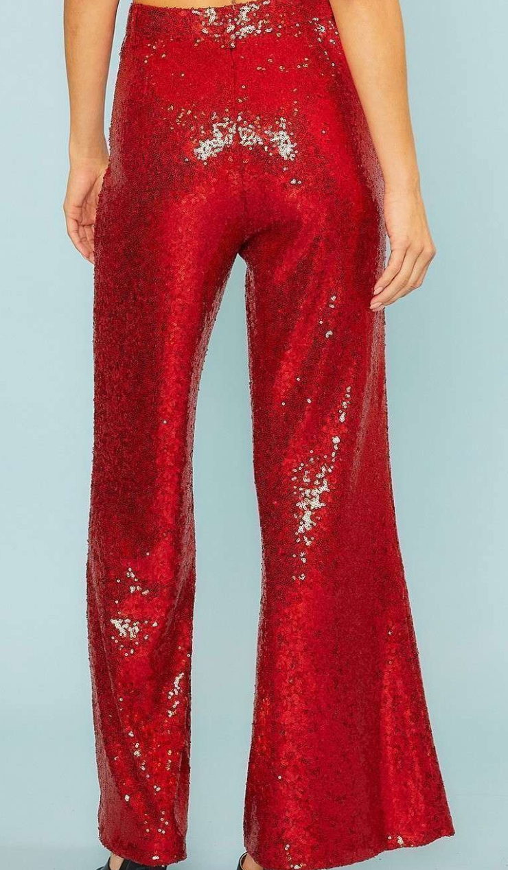 These striking red sequin flare pants combine glamour and comfort with a high waist and wide-leg design that flatters every shape. Crafted from a blend of 95% polyester and 5% spandex, they offer just the right stretch for ease of movement. Ideal for holiday gatherings or festive evenings, they ensure you stand out with confidence and style.