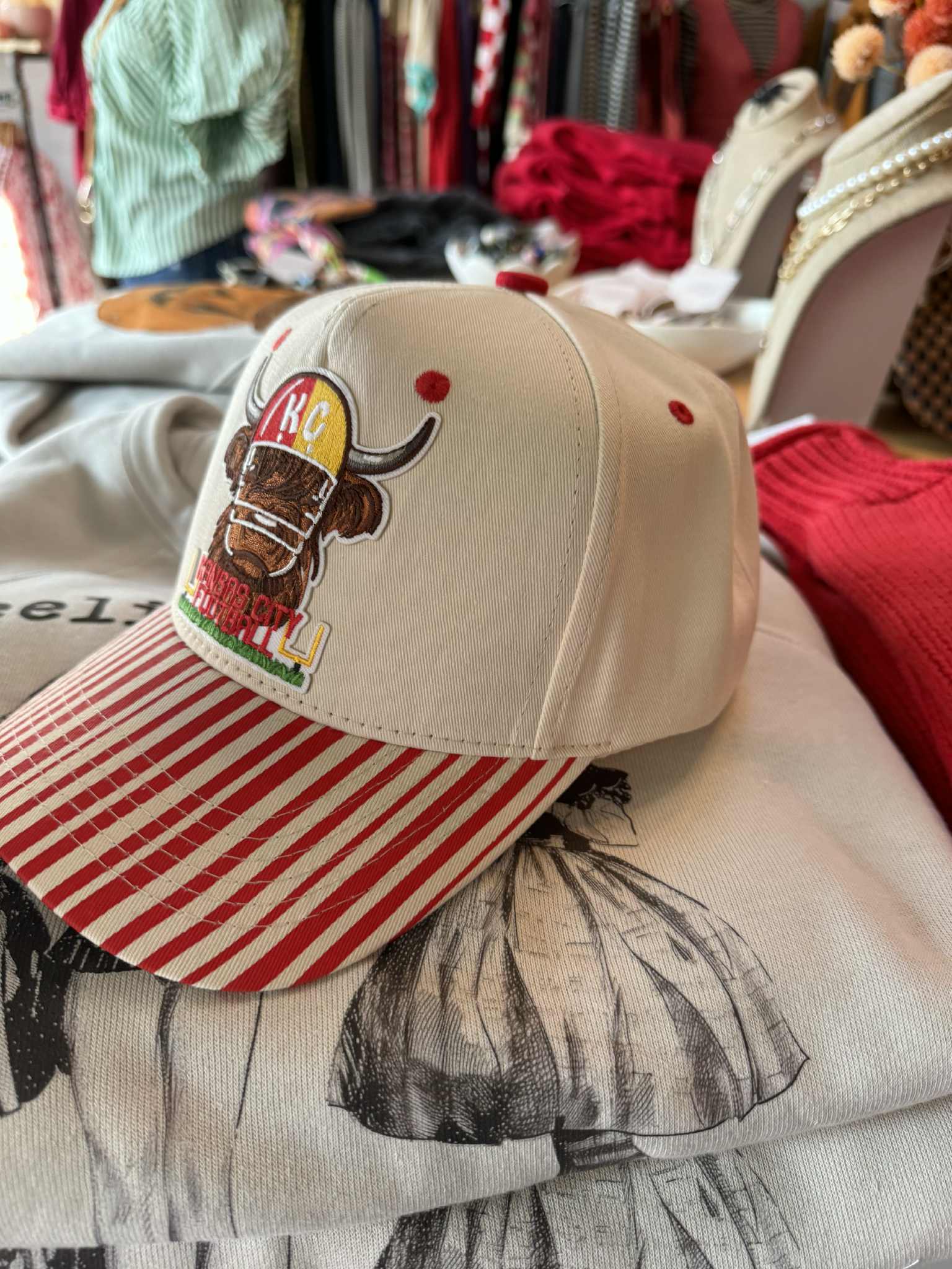This cotton trucker hat features a bold red and white striped bill and a playful KC football patch on the front, perfect for showing your team spirit with style. The adjustable velcro back strap ensures a comfortable, secure fit for all-day wear. Designed for fans who appreciate both function and fun, this hat is a great way to support your favorite team wherever you go.