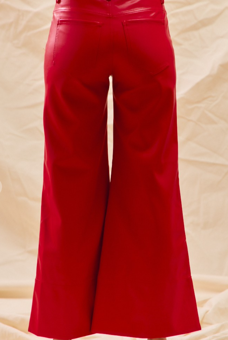 Elevate your wardrobe with these striking red mid-rise wide leg flare pants that combine bold style with everyday comfort. Crafted from a 50/50 blend of PU and polyester, the stretch faux leather fabric offers a sleek, modern look while maintaining flexibility for all-day wear. The flattering mid-rise cut and flowing wide leg silhouette create a confident, fashion-forward shape. Practical front pockets keep your essentials within reach.