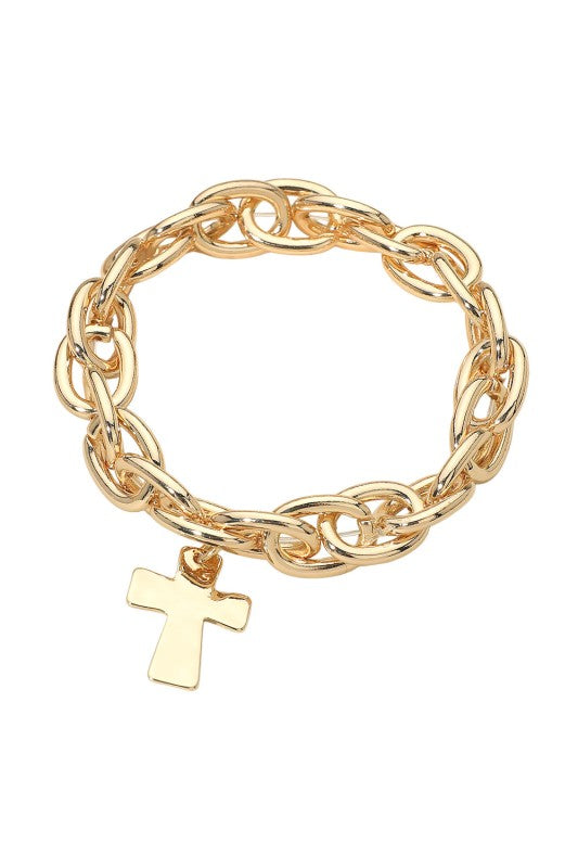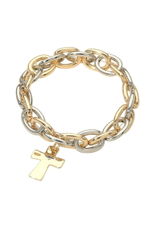 Wear your faith with confidence in this eye-catching chunky chain bracelet. Bold interlocking links frame a graceful dangling cross charm, creating a piece that's both spiritually meaningful and effortlessly modern. The stretchy design ensures a comfortable fit for any wrist, while the substantial 0.75" x 1" charm makes a genuine impact. Choose from classic gold, elegant silver, or a trendy mixed metal finish to suit your style. Lead and nickel compliant, this versatile accessory works beautifully layered with other pieces or as a standalone statement.