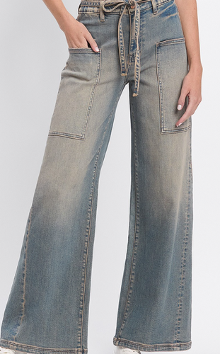 High Rise Baggy Wide Leg Jeans w/ Elastic Tie Waistband