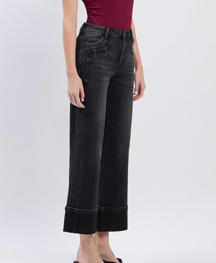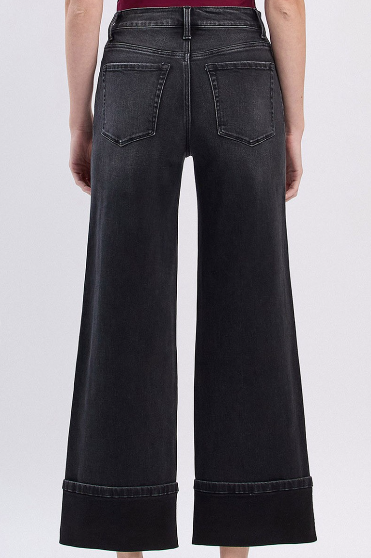 Make a bold statement in these super high-rise cuffed baggy jeans. Crafted from comfort stretch denim with 98% cotton and 2% spandex, they offer the perfect blend of style and wearability. The 11" rise sits high on the waist, while the generous wide leg and single cuff hem create an effortlessly cool silhouette. At 21" across the leg opening, these ankle-length jeans deliver that coveted baggy fit that works with everything in your wardrobe. Whether you're dressing them up or down, these black jeans are a versatile essential that celebrates your personal style.