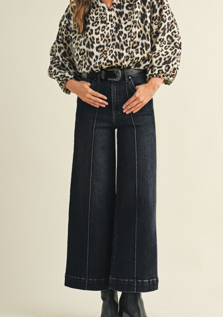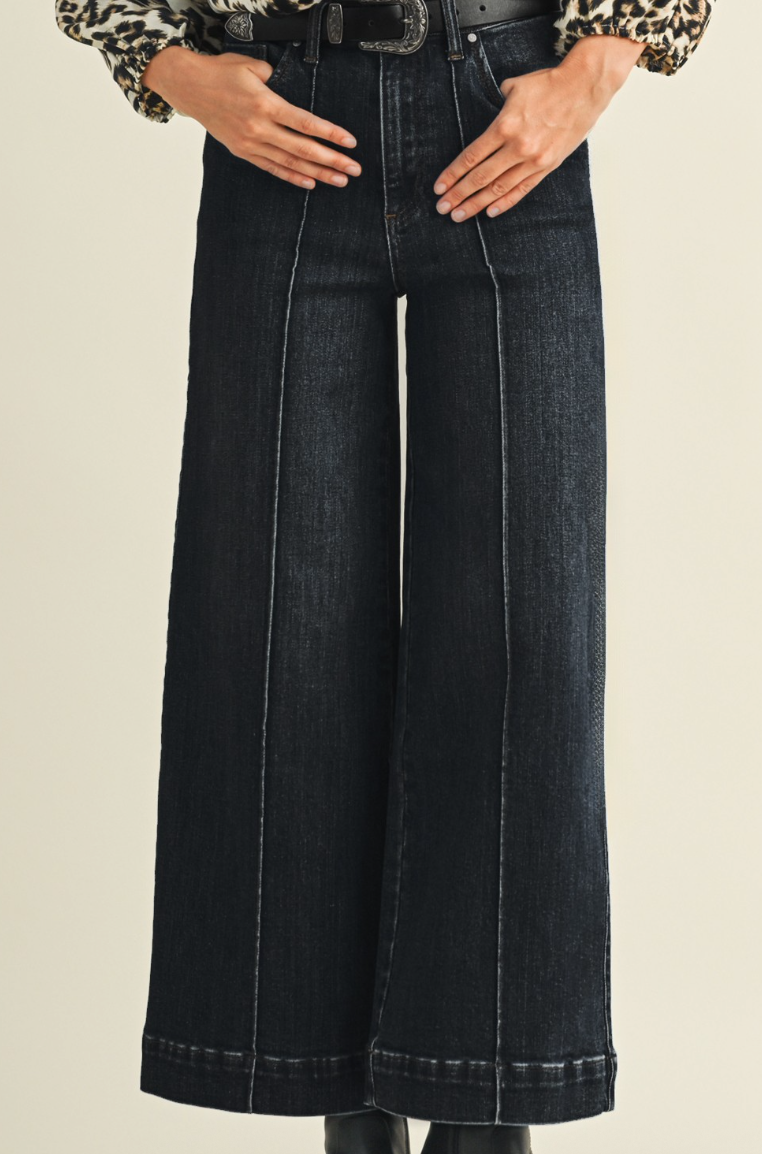 Elevate your denim collection with these striking black wide-leg jeans featuring a flattering high-rise cut and refined pin tuck detailing. Crafted from a comfortable stretch blend of cotton, polyester, rayon, and spandex, these jeans move with you throughout your day. The minimalist single back pocket design adds a modern touch, while the generous wide-leg silhouette creates an effortlessly chic, contemporary look. Perfect for dressing up or down.
