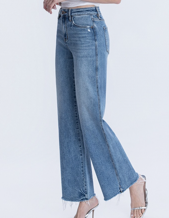 Elevate your denim game with these high-rise distressed slit hem vintage flare jeans. Crafted from comfortable stretch denim, they feature a flattering high-rise waist, classic five-pocket styling, and an on-trend distressed slit hem that adds edge to any outfit. The medium wash and full-length cut deliver timeless appeal, while the vintage flare silhouette brings retro charm to your wardrobe.
