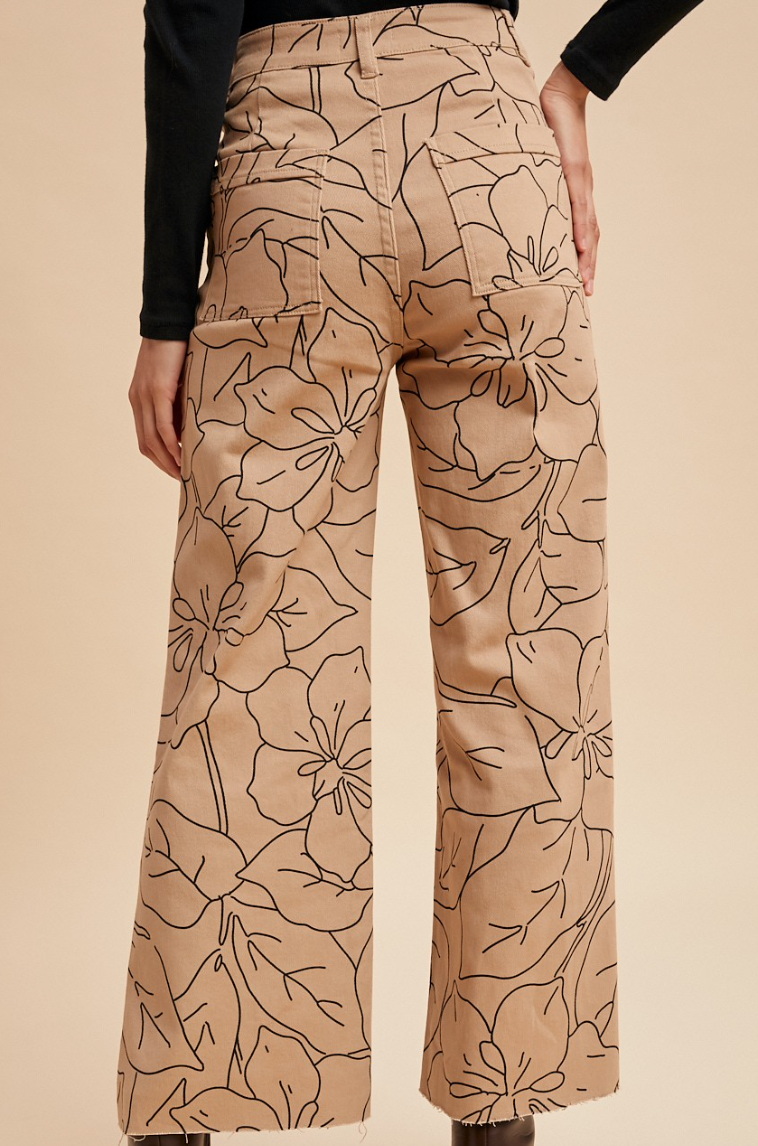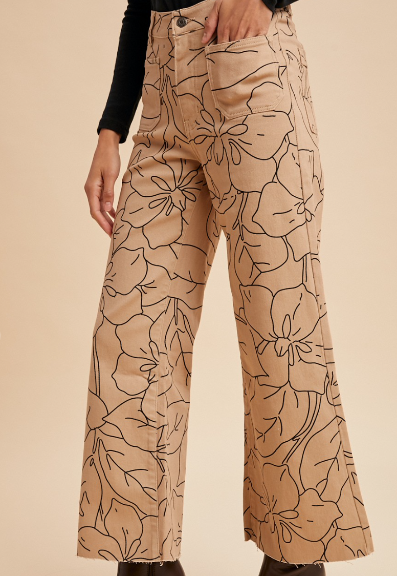 Elevate your denim game with these stunning stretch monochrome floral print wide leg jeans. Crafted from a comfortable 97% cotton and 3% spandex blend, they offer the perfect balance of structure and flexibility for all-day wear. The high-rise silhouette flatters your figure while the cropped wide leg creates an effortlessly chic, modern look. Detailed front and back pockets add both style and function. Available in a versatile latte tone, these jeans are the perfect foundation piece for any wardrobe.