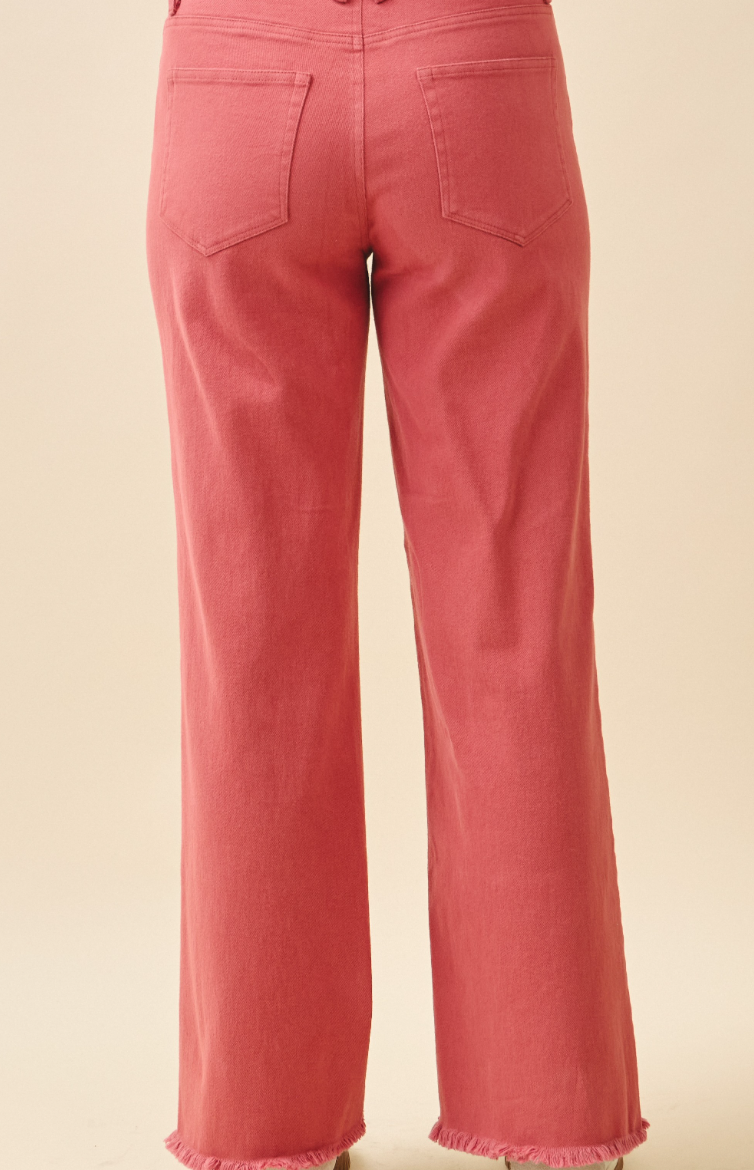 Rose-hued wide-leg jeans that blend timeless style with contemporary flair. The high-rise silhouette flatters your frame while raw fringe hems add an effortlessly undone vibe. Crafted from a breathable cotton-spandex blend, these jeans move with you throughout your day—whether you're running errands or making a statement. A wardrobe essential that feels as good as it looks.