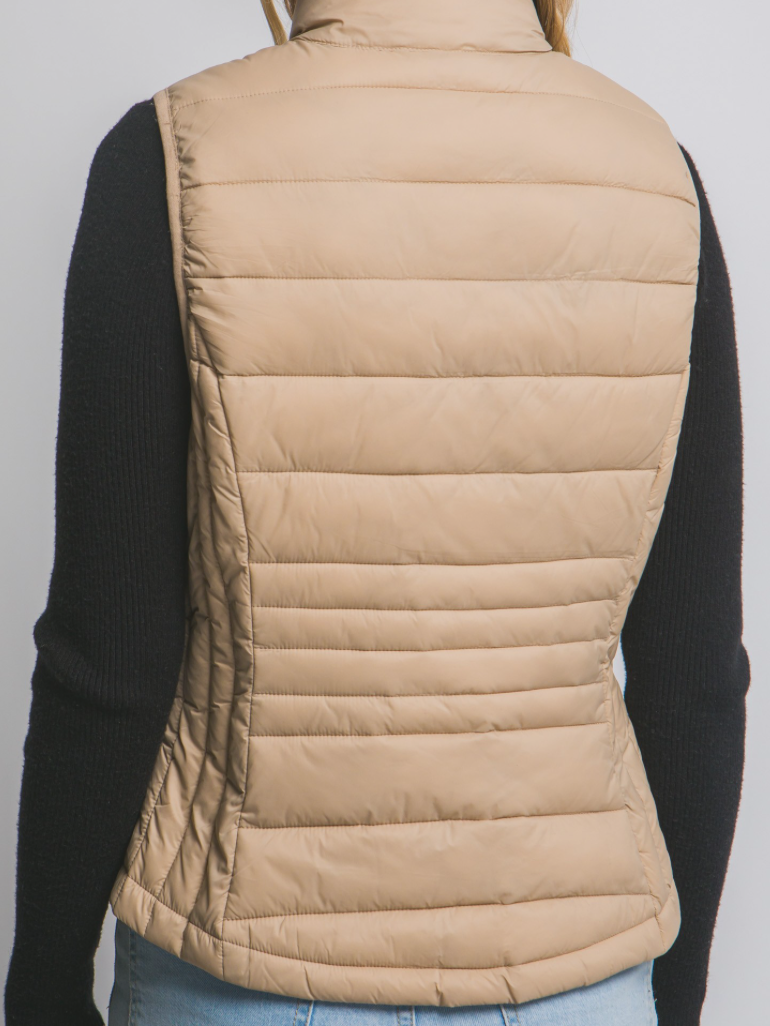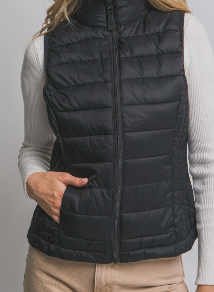 Stay warm without the bulk. This ultra-lightweight thermal puffer vest delivers exceptional insulation in a sleek, fitted silhouette. The lightly padded design features a stand-up collar, front zip closure, and two convenient side pockets. Lined throughout and crafted from 100% nylon, it's engineered with strategic seaming for a flattering, slim fit. Perfect layering piece for cool weather—lightweight enough to wear under jackets or on its own.