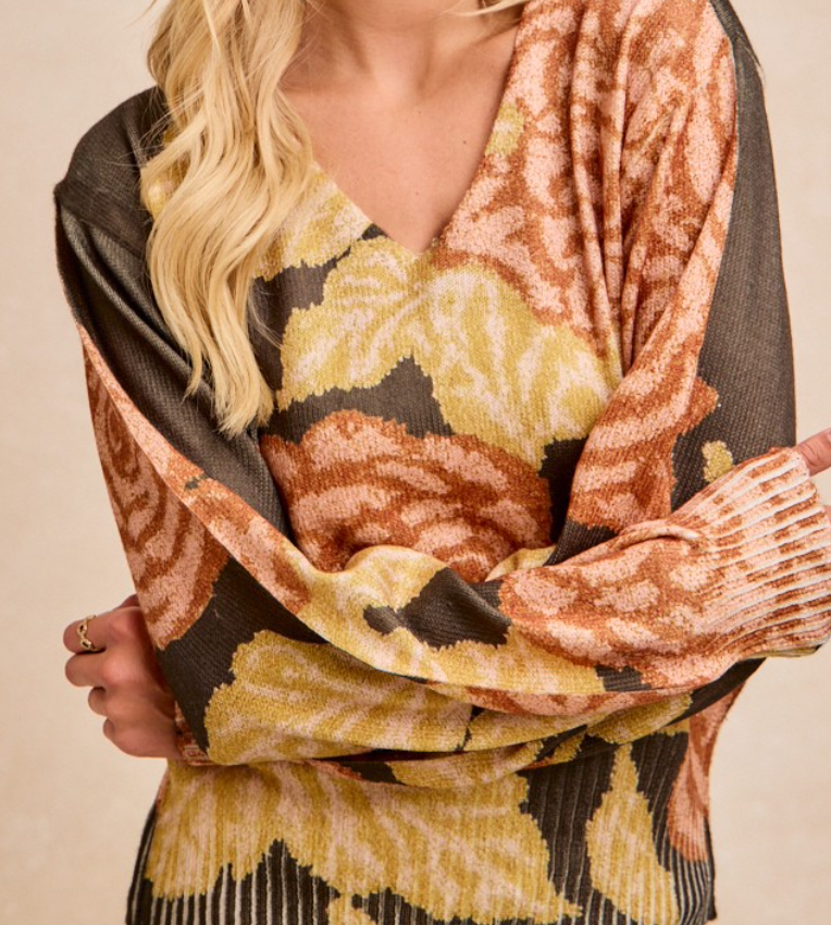 Meet your new favorite layering piece—a V-neck knit top that pairs an earthy olive base with a cheerful floral print for instant personality. Those voluminous balloon sleeves? They're here to add a dash of fun and movement to every outfit. The smart fabric blend of acrylic, polyamide, and polyester keeps things cozy, breathable, and easy to care for. Dress it up with tailored trousers or keep it casual with your go-to jeans. This playful top is ready to become a wardrobe staple that works as hard as you do.